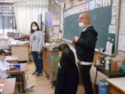 1−1の生活科です。チャールズ先生をお招きして、「色の英語表現」の活動をしています。ペアで振り向いた時に、カードの色を英語ではやくいった人が勝ちです。