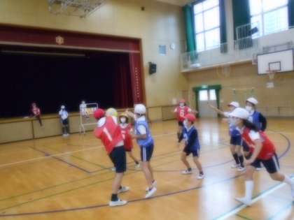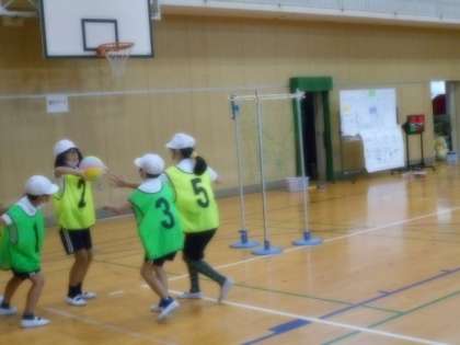 バスケットボールのゴールよりもゴールが大きく多くの児童に得点のチャンスがあります。
