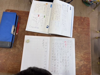 りんごとなし、ぶどうとマスカットなど、2つをくらべて、同じところ、ちがうところを文章にして書いています。