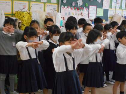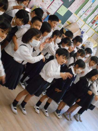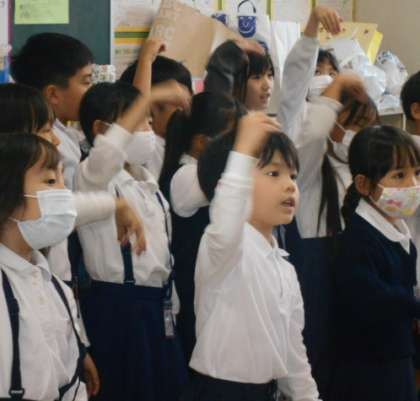 「きっと明日はいい天気」という歌をみんなで練習しています。