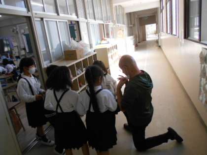 カラーゲームをしました。先生に「ブルー」「グリーン」など一人一人が色を指示されます。その色を列の友だちに英語で伝えて、最後の人が黒板に張られた「色のボード」を早い者勝ちでとるゲームです。
