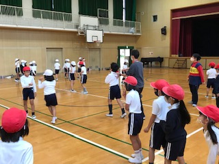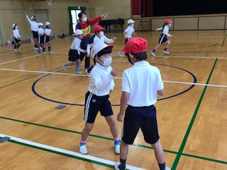 今日は雨で運動場は使用できませんが、体育館でじゃんけんゲームを取り入れ、楽しく体育の学習をしています。元気いっぱい活動する姿が見られます。