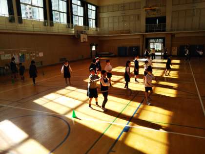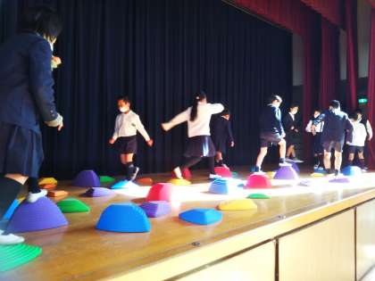 バランスストーン、ドッジボール、マット運動、などで楽しく遊んでいました。