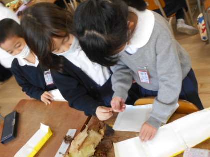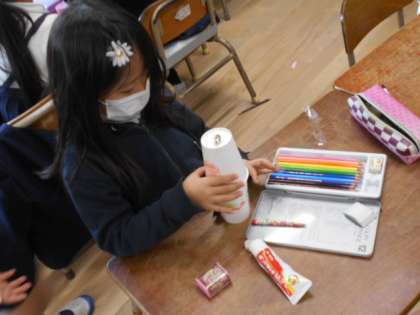 「秋見つけ」で見つけた物を入れるはこを作ったり、やじろべえ、ルーレット、マラカスを作ったりしていました。とっても楽しそうでした。