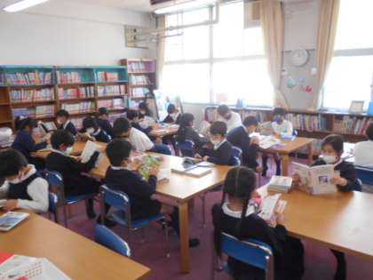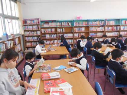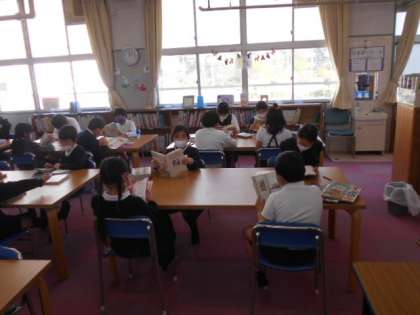 図書館の前を通ると、くつばこには、たくさんのくつが入っているのに、図書館からは声が聞こえてきません。3−2の子どもたちが静かに本を読んでいました。さすがでした。