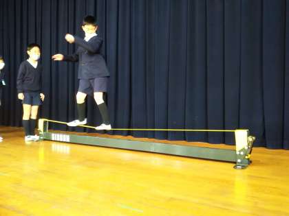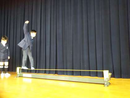 新しい遊具が紹介されました。「スラックライン」といって、ピンと張り巡らされた帯の上を渡り切るスポーツです。