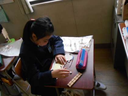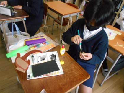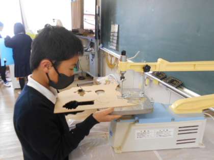 5−2の図工は、「糸のこの寄り道さんぽ」というタイトルで、コルクボードの伝言板を作っています。ほぼ全員が仕上げです。「さすが!」という作品ばかりです。