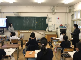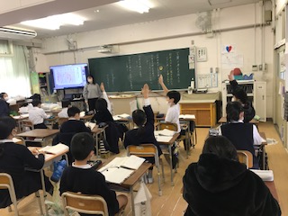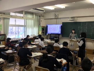 考えを言葉で伝える学習です。姿勢よく、手のあげ方も大変マナーよく、気持ちのよい空気が流れています。話をよく聞き合って話し合いを深めていました。