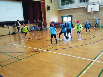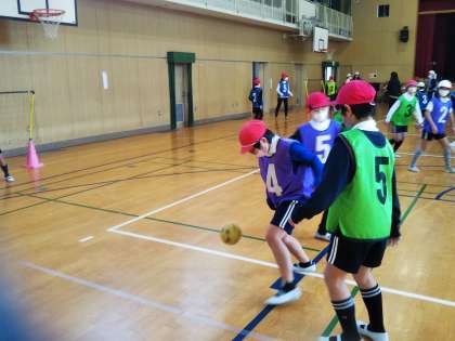 体育館で、キーパーありの5対5のゲームをしています。ボールはスポンジボールを使っています。
