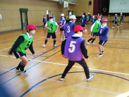 5−1の体育です。校長先生の出前授業で「サッカー型のゲーム」の学習をしています。