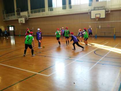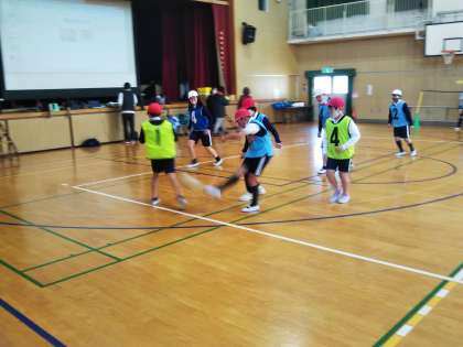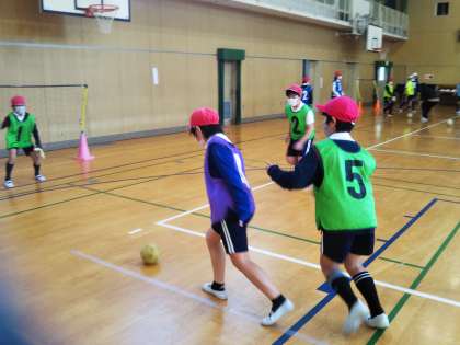 ドリブルやキックのこつや、ボールがラインを出そうになった時のターンのしかたを学びました。狭いコートなので、ボールのはげしい取り合いが続きます。