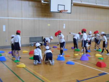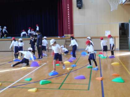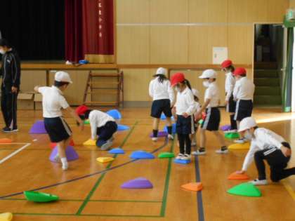 写真は、いろいろな高さのブロックを落ちないように渡っていくバランスブロックです。