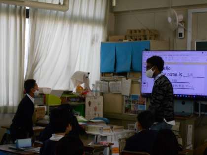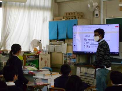 新しく来られたC-NET(ネイティブスピーカー)のモリス先生の5−2での初めての授業です。