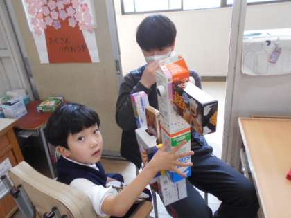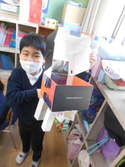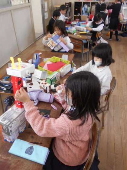 家から持ってきた箱を組み合わせて、動物や乗り物など思い思いのイメージで工作をしました。