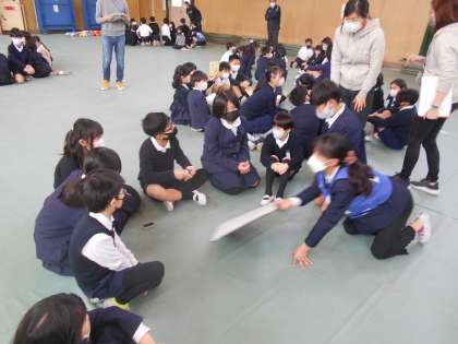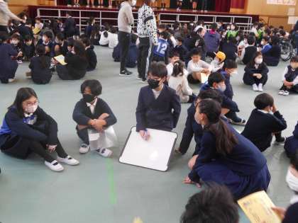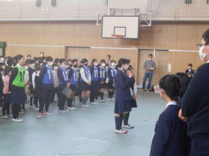 在校生代表がお祝いの言葉を発表した後は、スマイル班で「6年生クイズ」で盛り上がりました。