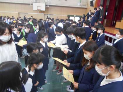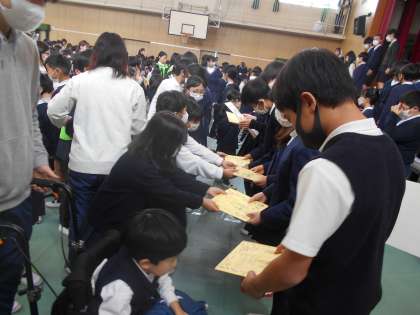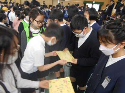 スマイル班の代表の児童から班の卒業生にお祝いの寄せ書きのプレゼントがありました。