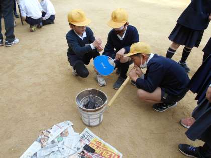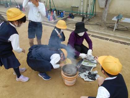 最近はキャンプを楽しむことも多いようで、バーベキューやカレー作りをしている子もいるようです。しかし、今日は点火剤も使いません。新聞紙、杉の枝、わりばし、消し炭で木炭に火を点けます。