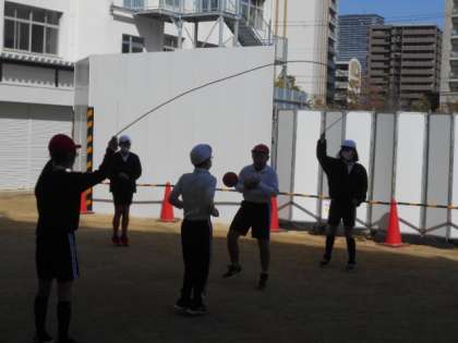 6年生の体育です。「体つくり運動」で、大なわで様々な動き作りを行いながら、巧みな動きをグループで工夫していました。
