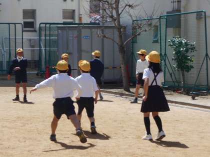3−1が春の日差しの中で、「だるまさんがころんだ」で楽しんでいました。