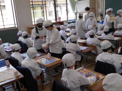 1年生は、お兄さんお姉さんが、おかずやパンを食器に入れるところや運ぶところを、自分たちだけで、給食の準備ができるようによく見ていました。