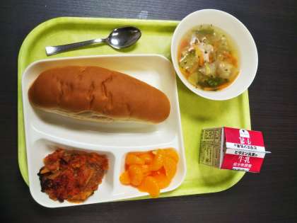 今日は、レタスのスープ、じゃがいものミートグラタン、みかん、パン、牛乳でした。