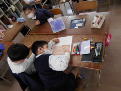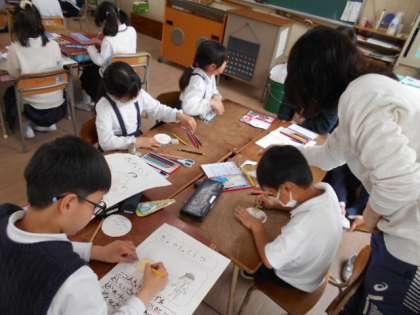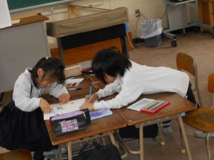 2−1の子どもたちが、1年生と「がっこうたんけん」をする準備をしていました。