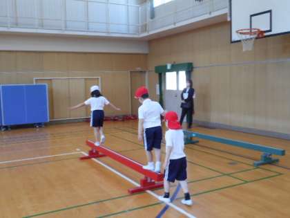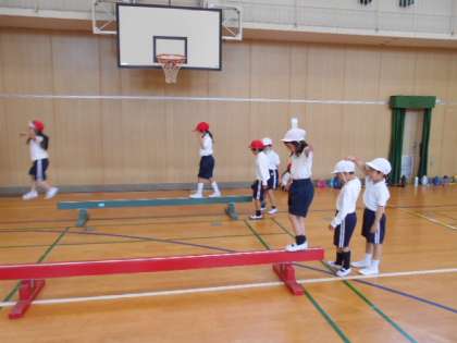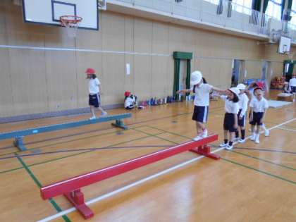 1年生のたいいくです。へいきんだい、とびばこ、マットなどを使った運動遊びをしています。