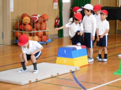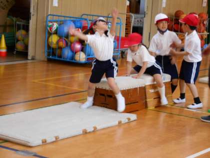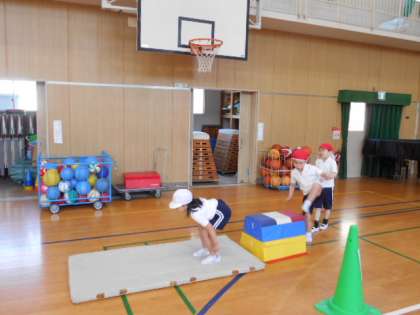とびばこ遊びは、手を使って体を支えたり、とび箱からジャンプしてひざを曲げて着地したり楽しみながら、大切な動きを身に着けられるように遊んでいます。