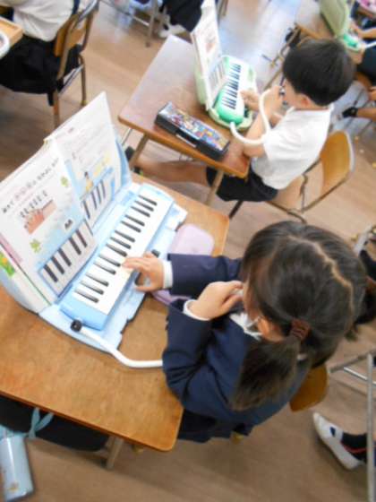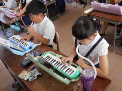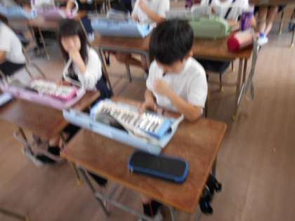 2−1の音楽です。けん盤ハーモニカの学習をしています。