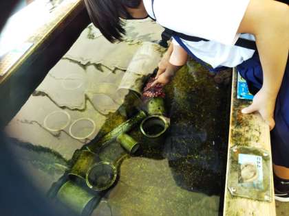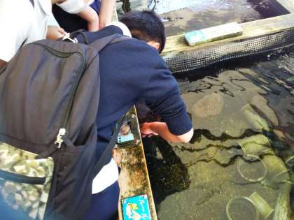 生き物をじかに触れるコーナーです。タコの吸盤に吸い付かれます。タコも水をブシューとかけます。なかなか面白かったです。