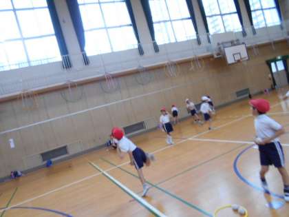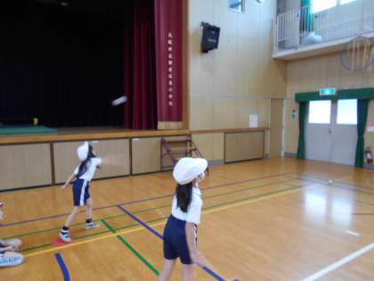 スポーツテストに備えて、ソフトボール投げの練習をしています。