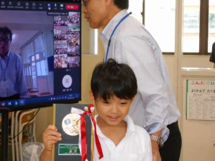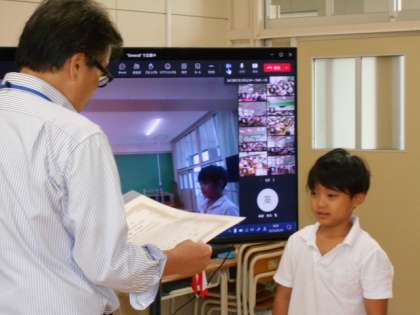 校長先生のお話の後、わんぱく相撲の寝屋川市大会で優勝した児童の表彰がありました。