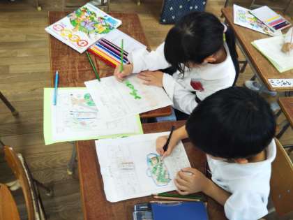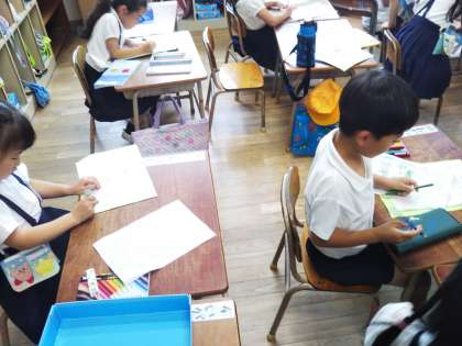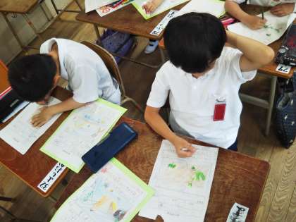 「かんさつしたことをかこう」というめあてで、あさがおのふたばを観察して描いていました。