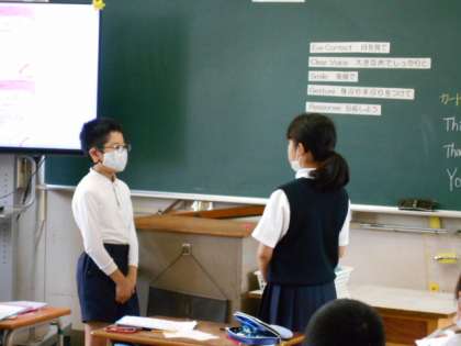 「あなたの名前を教えてください。」「○○です。」「どんなスペルですか?」「ゆくわかりました。」「誕生日は何月何日ですか?」「June ○○です。」「誕生日は何がほしいですか?」「○○がほしいです。」今まで学習してきたことをみんなの前で、二人で会話して発表していました。