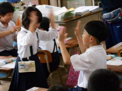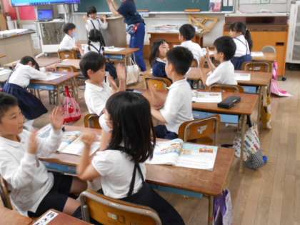 歌に合わせて大勢でダンスをしたり、ペアで動いたりして楽しく学習していました。