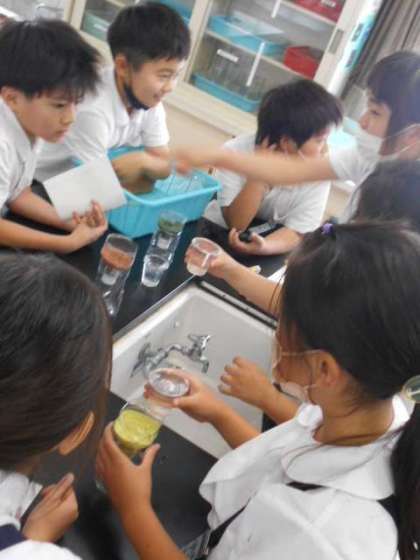 「土の種類と水のしみこみ方」の実験をしています。