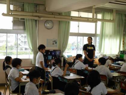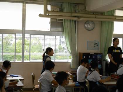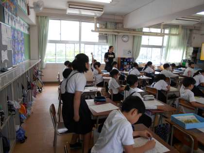 4−2の食育です。昨日に引き続いて海老江西小の栄養教諭の先生にご来校いただきました。