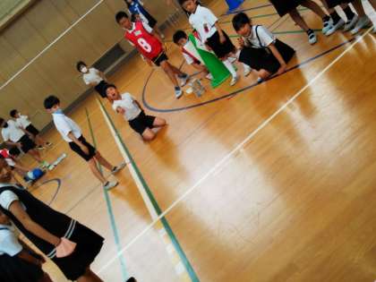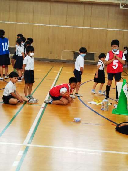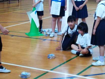 写真は、ガムテープカーリングです。ビニール袋で包装されたガムテープを滑らせて止まったところが、10点だったり、100点だったりします。難しいです。