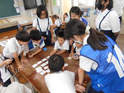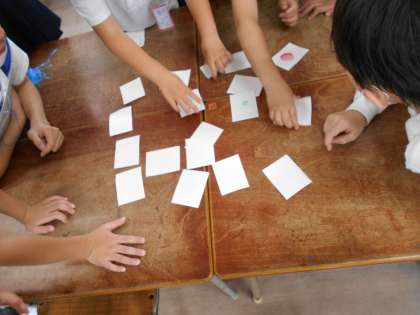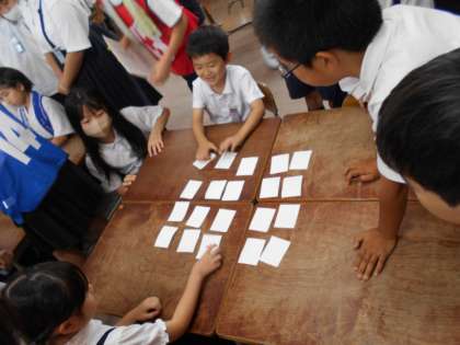 写真は「絵合わせ」です。トランプの神経衰弱(しんけいすいじゃく)の手描きの絵みたいな感じです。グループの協力が大切です。