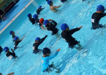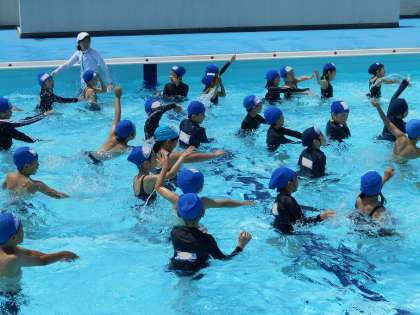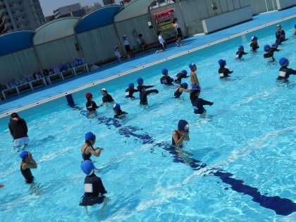 音楽に合わせて、準備体操をしたり、プールの中で基本的な動きをいろいろ試してみました。
