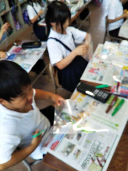 カラーペンで、透明ファイルのはしから線を引きます。その線は、曲線でもぎざぎざの線でもかまいません。2本の線を引きます。そして、線に沿ってハサミで切り取っていきました。さて、どんな工作ができるのでしょうか?!
