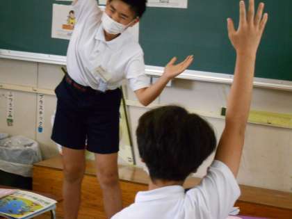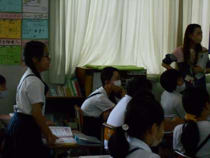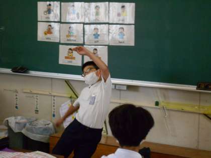 次に「苦い」「からい」「しょっぱい」「あまい」など味に関する英語表現を復唱して、どんな味を表しているかを当てるジェスチャーゲームをしました。