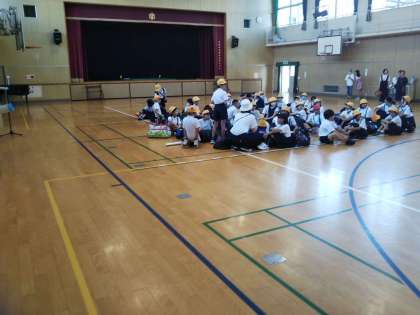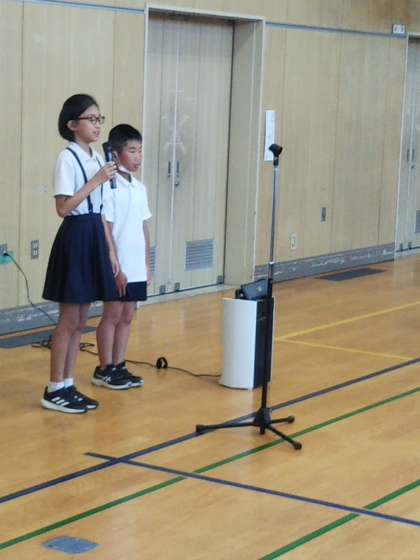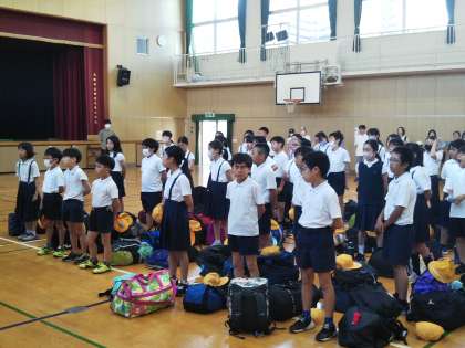 梅雨明けの青空のもと、林間学習に向かいます。出発式です。早朝からお見送りありがとうございました。