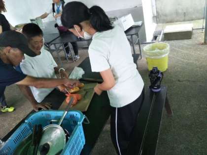 カレーの野菜は、皮をむき、けがをしないように切っています。