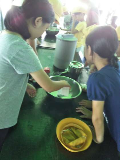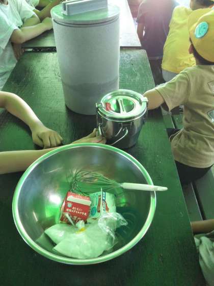 アイスクリームづくりです。スタッフの方から レシピを教えていただきました。塩と砂糖を間違えない、順番を間違えない、アイスクリームに塩水が入らないようにするなど大切なことをお聞きしました。