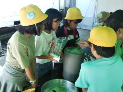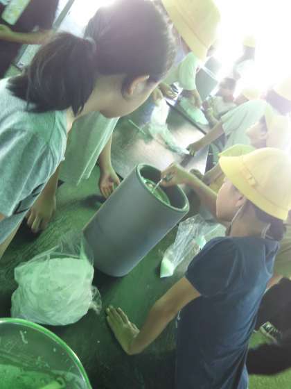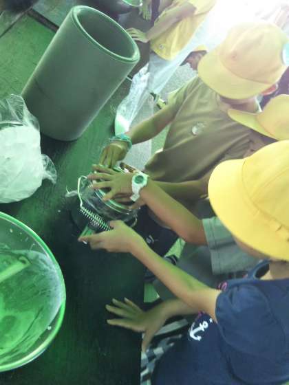 ホイップクリームにミルクを入れ、密閉容器に入れます。さらに、大きな容器に氷と塩を入れて密閉しました。