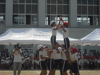 運動会の後半の様子です。「全校大玉送り」「騎馬戦」「組立体操」の1コマです。