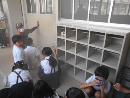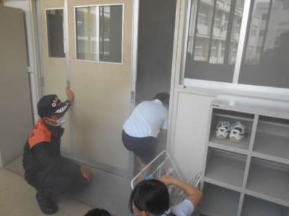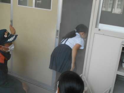 写真は「煙中体験」です。無害のけむりが立ち込めた教室の中を歩いて、煙のがいっぱいになると方向がわからなくなるなどの体験をしました。もちろん実際の火事では、有毒ガスが発生することも教わっています。