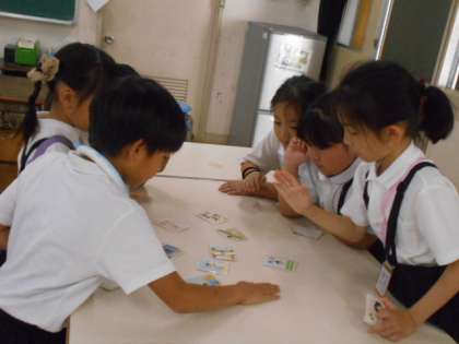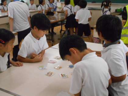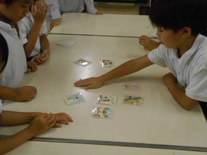 写真は、「防災かるた」です。地域の方が、読み上げてくださるカルタを取り合います。