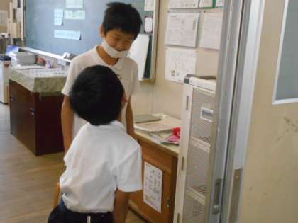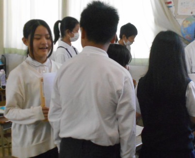 友だちや先生たちと教室の中で、「●●はどこですか?」「ここをまっすぐ机3つ分歩いて・・・」のようにお互いに英語で案内する練習をしました。